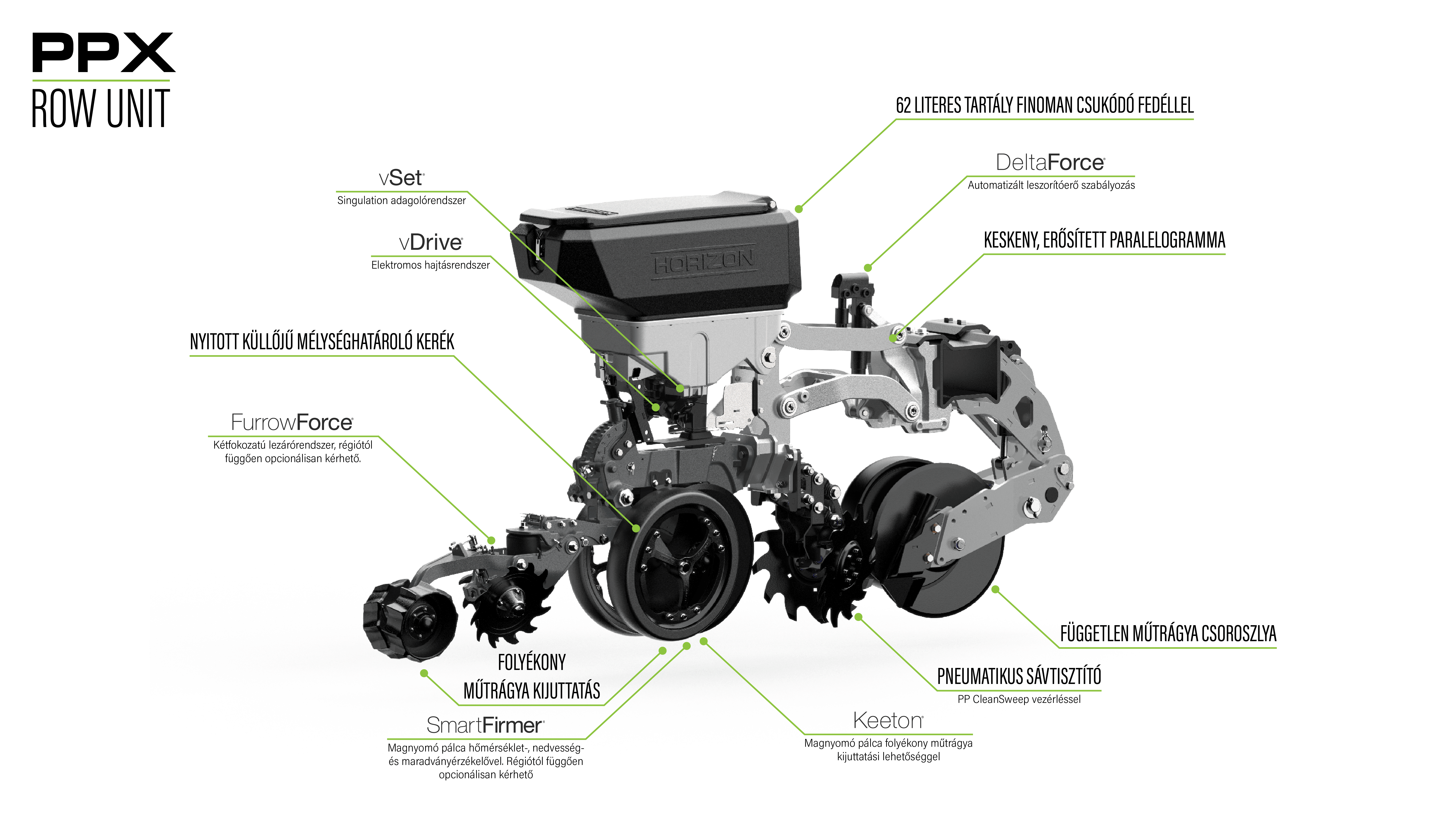 A Precision Planting technológiával felszerelt Horizon PPX biztosítja, hogy minden elvetett mag a lehető legjobb kezdeti körülményeket kapja, növelve ezzel az esélyt, hogy nagyobb terméshozama lesz.