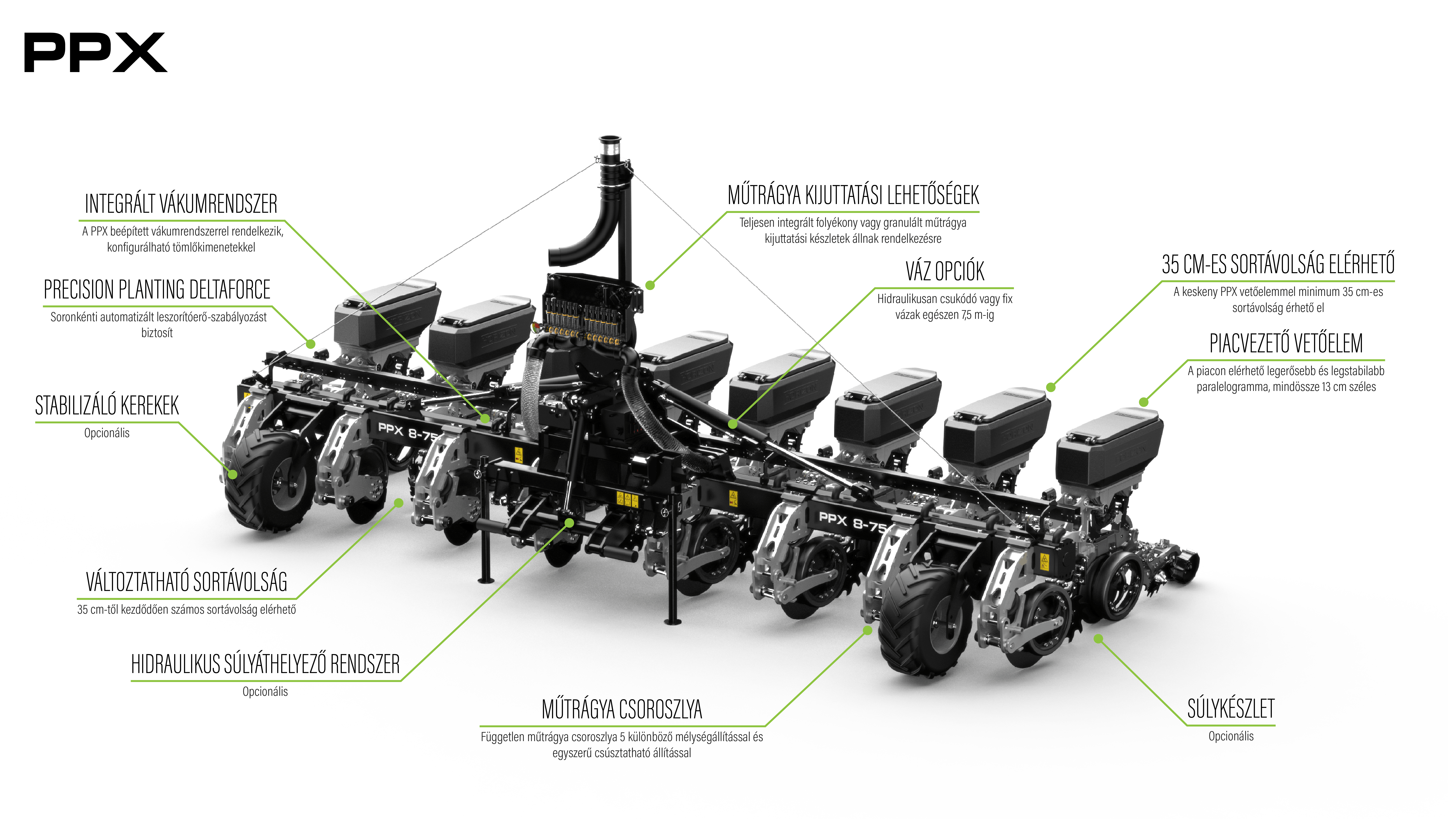 A Precision Planting technológiát alkalmazó PPX szemenkénti vetőgép úgy lett kialakítva, hogy a magokat még a legzordabb körülmények között is tökéletesen lehelyezze az optimális termesztési közegbe.